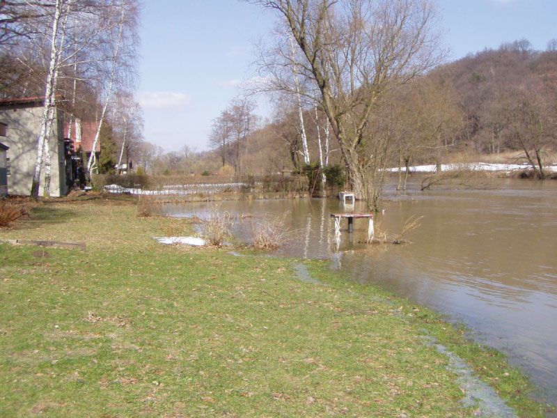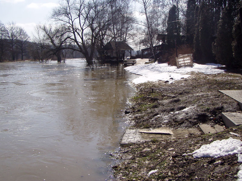 Kulminace řeky Opavy v Děhylově v prostoru loděnice (20.3.2005 odpoledne)